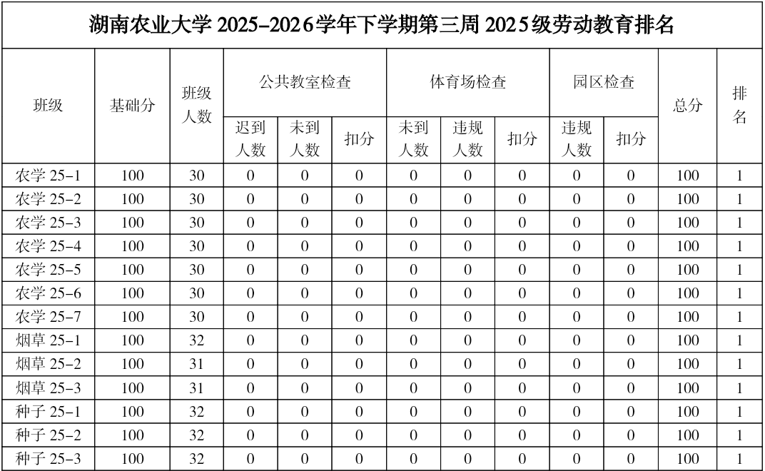 第三周各年级课堂检查情况较差,其中农学24-4、农学25-3、农学25-4、烟草25-1、农学25-7班的缺勤违纪现象较为严重。希望各年级能及时改正,切实加强学风建设。